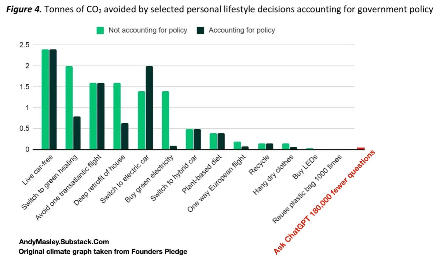 The slogan “Every Watt-hour matters” implies something really dangerous. It implies that because Bob and Freddy were making any adjustments in their lifestyles that reduced emissions at all, they were contributing to end the climate crisis. Compared to Kate, their efforts rounded to zero. They became distracted by super low impact methods for an entire year, when they could have had as much impact as entire cities of people. Going around and telling people who care about the climate that they should use their limited time and energy to worry about ChatGPT is a bad distraction from actions that can do literally millions of times as much good.