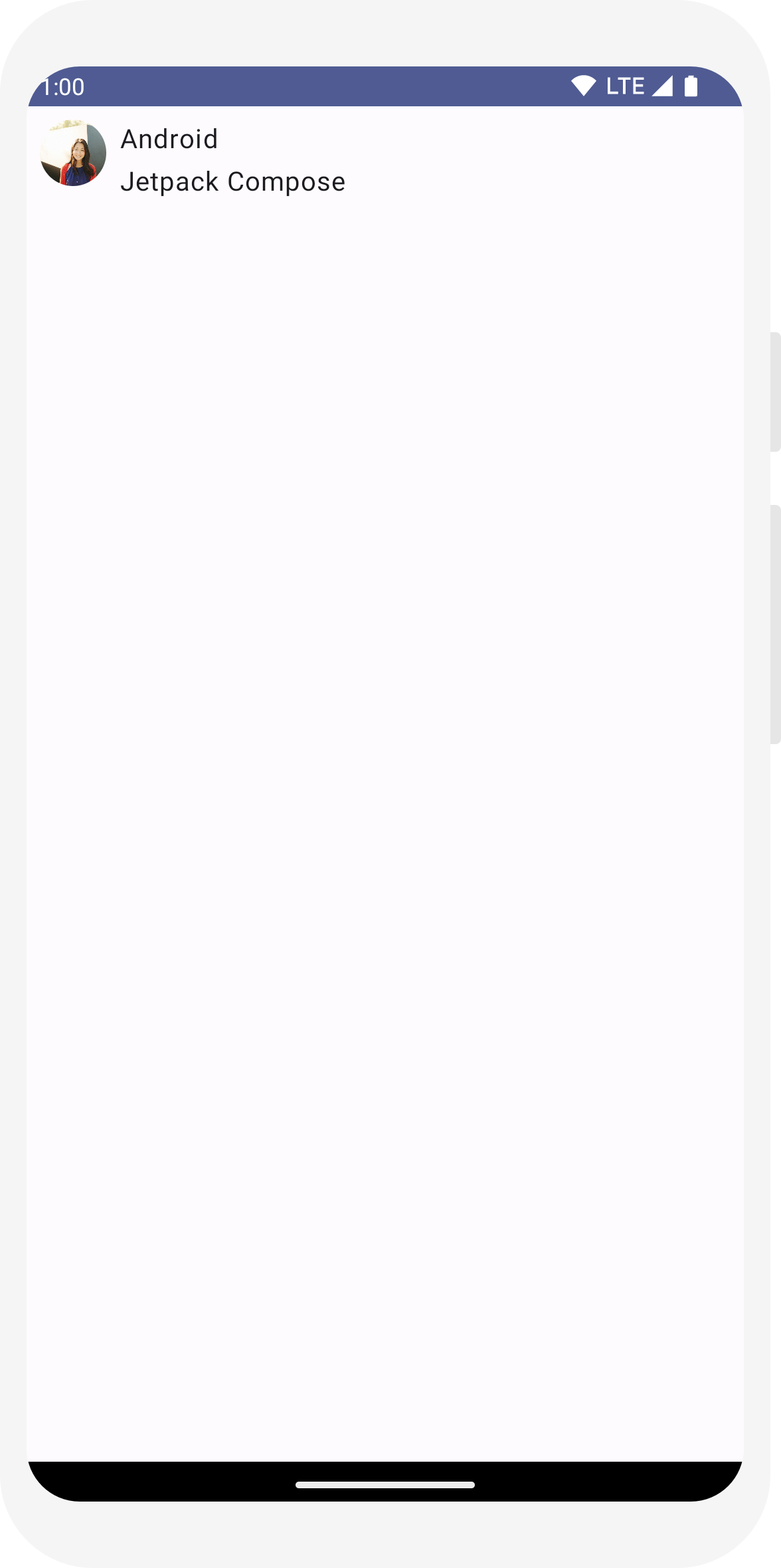 // ... @Composable fun MessageCard(msg: Message) { Row(modifier = Modifier.padding(all = 8.dp)) { Image( painter = painterResource(R.drawable.profile_picture), contentDescription = null, modifier = Modifier .size(40.dp) .clip(CircleShape) .border(1.5.dp, MaterialTheme.colorScheme.primary, CircleShape) ) Spacer(modifier = Modifier.width(8.dp)) Column { Text( text = msg.author, color = MaterialTheme.colorScheme.secondary, style = MaterialTheme.typography.titleSmall ) Spacer(modifier = Modifier.height(4.dp)) Text( text = msg.body, style = MaterialTheme.typography.bodyMedium ) } } }