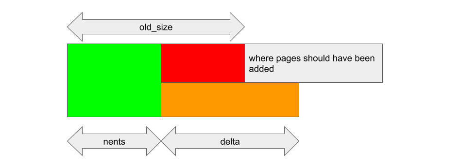 The situation, however, is very different when a region is grown during the race window. In this case, nents is larger than old_size when kbase_alloc_phy_pages_helper_locked and kbase_mem_grow_gpu_mapping are called, and delta pages are being inserted at index nents of the pages array: