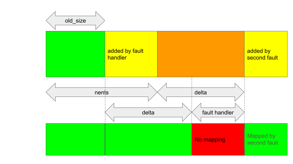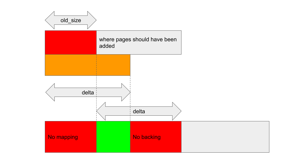 Note that as delta has to be non zero to trigger the bug, and as delta + old_size pages at the start of the region are mapped, it is still not possible to have the start of the region unmapped like in the case of GHSL-2023-005. So, my only option here is to shrink the region and have the resulting size lie somewhere inside the unmapped gap.