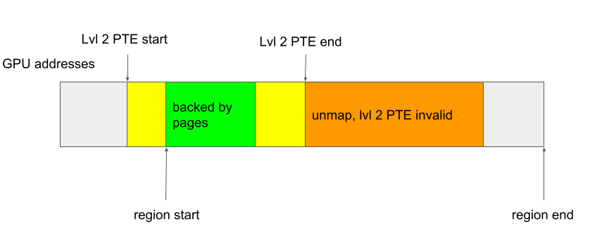 This, however, does not seem to create any problem either. The memory region still only has its start addresses mapped and there is no gap in the mapping. The pages that are not mapped are simply not accessible from the GPU and will get freed when the memory region is deleted, so it isn’t even a memory leak issue.