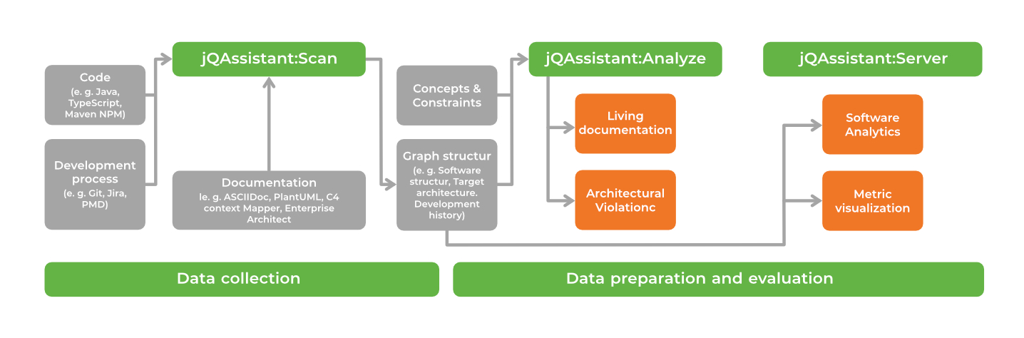 - Analyze - jQAssistant analyses the structures in the database by executing so called concepts (enrich the graph with additional information) and constraints (validate structures in the graph). These are either defined project-specific by the user or are distributed via plugins. Reports are created containing the constraint violations (returned rows of constraints) and concept results (e.g. enriched/updated data or graphical representations).