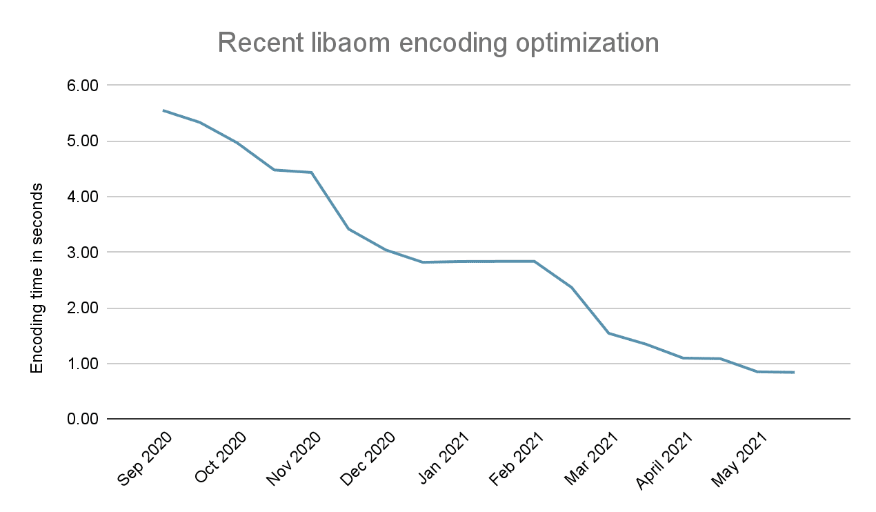 Libaom एक ओपन सोर्स AV1 एन्कोडर और डिकोडर है. इसे Alliance for Open Media में शामिल कंपनियां मैनेज करती हैं. साथ ही, इसका इस्तेमाल Google और सदस्य कंपनियों की कई प्रोडक्शन सेवाओं में किया जाता है. libaom 2.0.0 रिलीज़ और हाल ही में रिलीज़ किए गए 3.1.0 वर्शन के बीच, कोडबेस में स्टिल इमेज कोडिंग के लिए कई अहम ऑप्टिमाइज़ेशन जोड़े गए हैं. यह रिलीज़ उसी समय हुई थी जब Chrome में AVIF का इस्तेमाल करने की सुविधा जोड़ी गई थी. इनमें शामिल हैं: