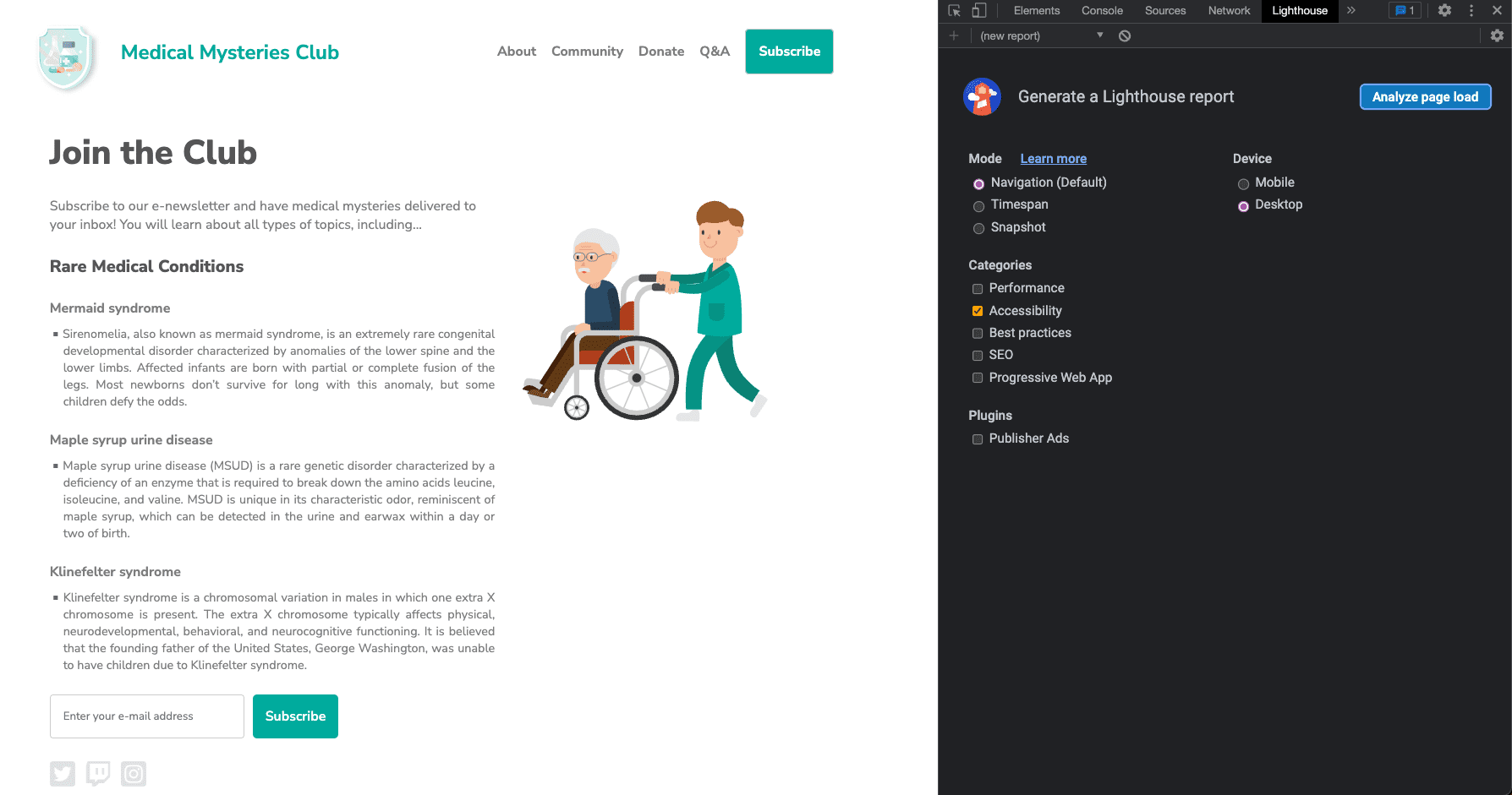 Site do Medical Mystery Club, com o painel do DevTools do relatório do Lighthouse aberto.