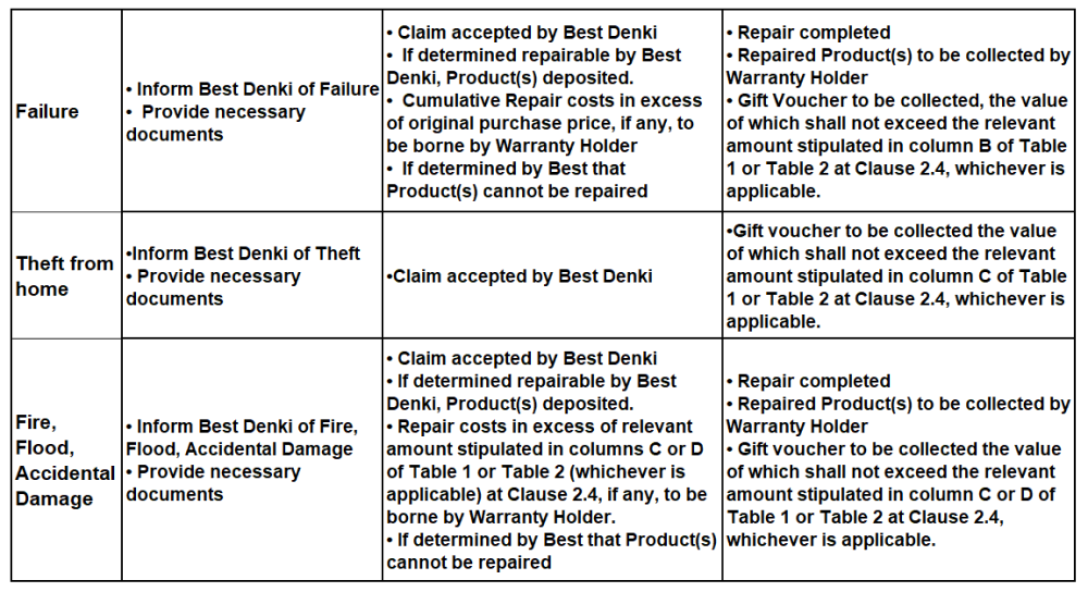 - In the event of damage to or loss of the Product(s) as a result of Failure, Fire, Theft from Home, Flood or Accidental Damage, the Warranty Holder shall inform Best Denki immediately. (A claim will not be accepted if there is delay in informing Best Denki) If it is determined by Best Denki that the Product(s) cannot be repaired, Best Denki shall make compensation by way of gift vouchers and the Warranty will terminate.
