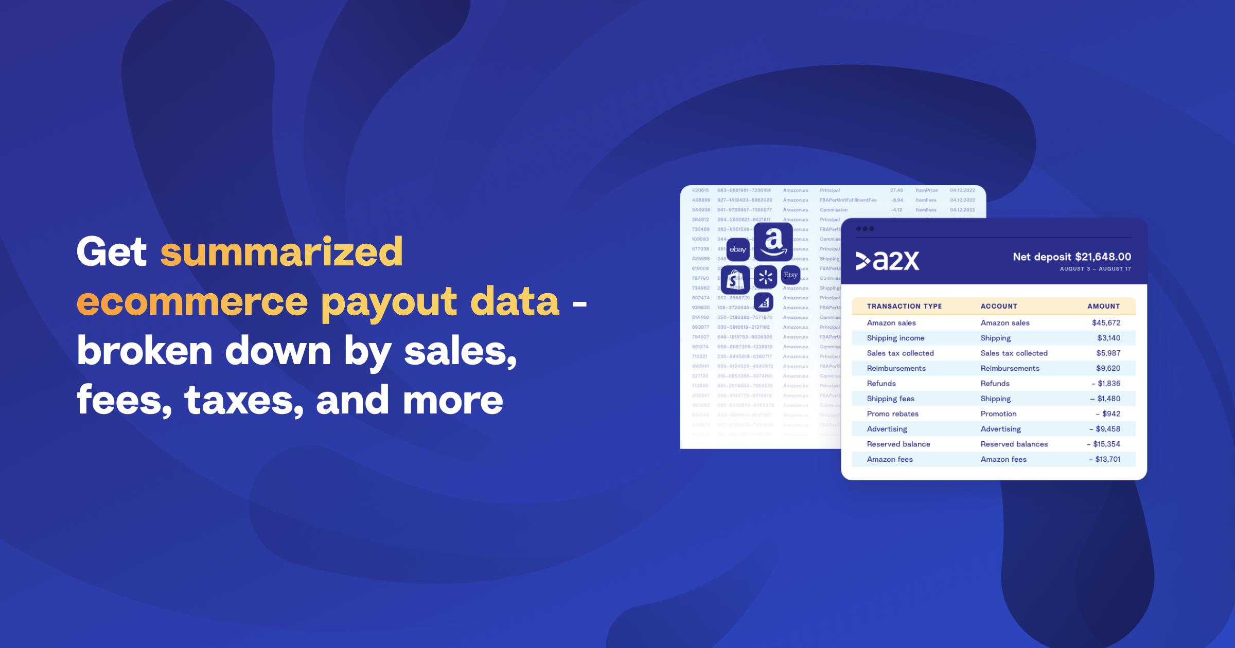 A2X automatisiert die E-Commerce-Buchhaltung für Shopify-, Amazon-, Etsy-, Walmart-, eBay- und BigCommerce-Verkäufer weltweit.