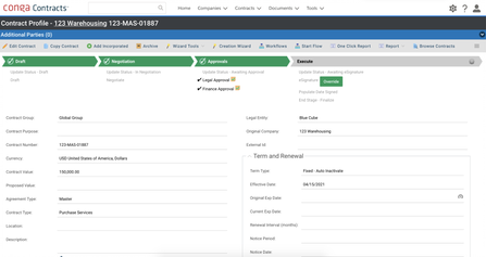 Conga CLM ist eine robuste Softwarelösung für das Vertragslebenszyklusmanagement, die darauf ausgelegt ist, den gesamten Vertragsmanagementprozess von der Erstellung bis zur Erneuerung zu optimieren und zu automatisieren. Diese umfassende Plattform adressiert die Komplexitäten des Vertragsmanagements und ist ein unverzichtbares Werkzeug für Unternehmen, die ihre Vertragsoperationen verbessern möchten. Durch den Fokus auf Effizienz, Risikominderung und verbesserte Transparenz befähigt Conga CLM Organisationen, ihre Vertragsprozesse effektiv zu optimieren.
