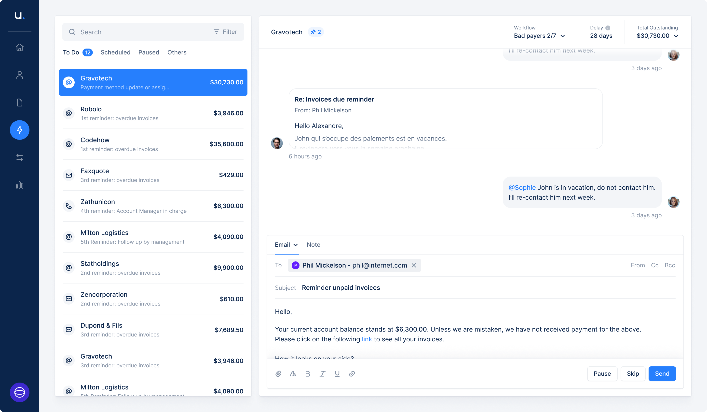 - Collaborazione migliorata tra finanza e team a contatto con i clienti (vendite, successo del cliente, gestione...), consentendo un approccio strategico coordinato a livello aziendale per essere pagati in tempo.